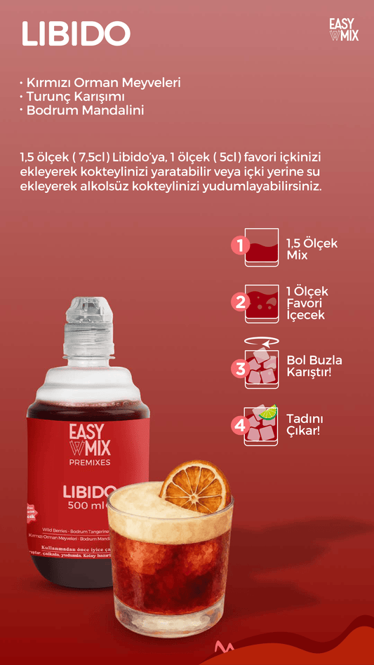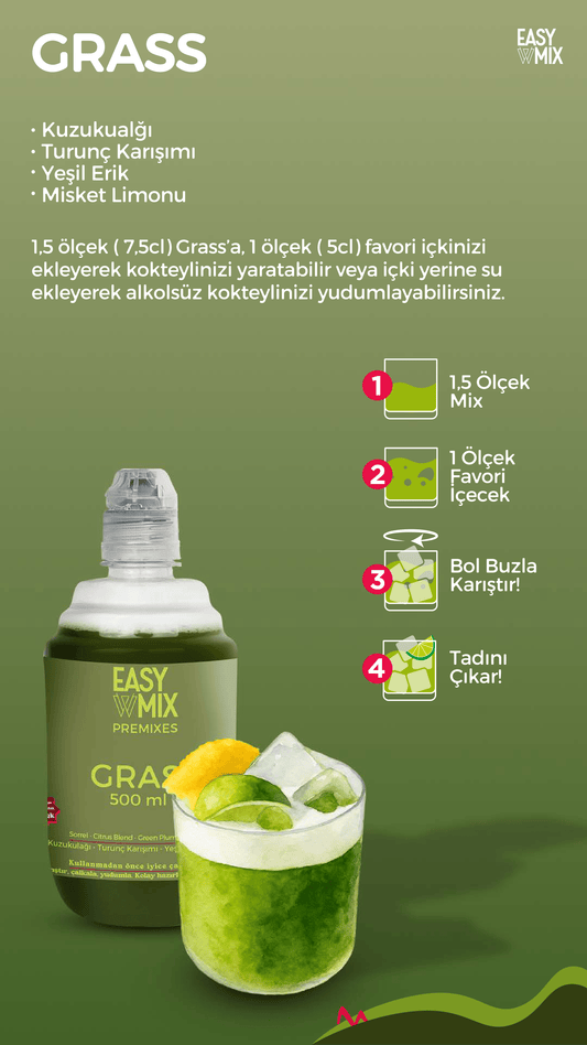 Easy Mix premixleri önerilen ölçülere göre hazırlayabilirsiniz. Bloody Mary ve Margarita hariç, diğer tüm Easy Mix premixleri için 1.5 ölçü Easy Mix Premix’e 1 ölçü tercih ettiğiniz baz ekleyin, iyice çalkalayın ve bol buzla servis edin.