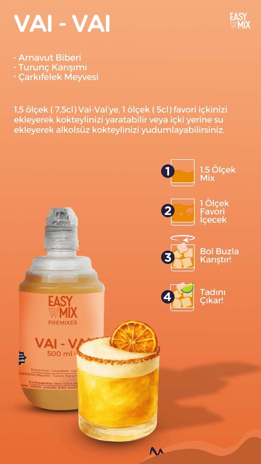 Kokteylinizi hazırlamak için Easy Mix Premix'inizi, dilediğiniz baz içeceği (alkollü veya alkolsüz), bol buz ve bir shaker yeterli. Kokteyl bardağınız da varsa, keyfiniz tamam!